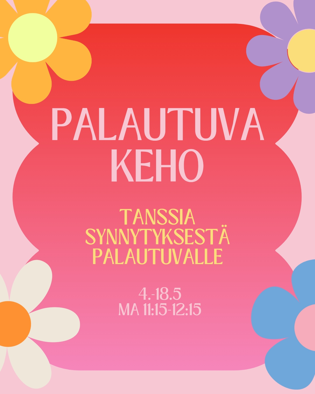 Tämä 3 kerran kurssi on suunnattu synnyttäneille äideille, jotka haluavat palata liikkeen ja oman kehon äärelle lempeästi mutta vahvistavasti.